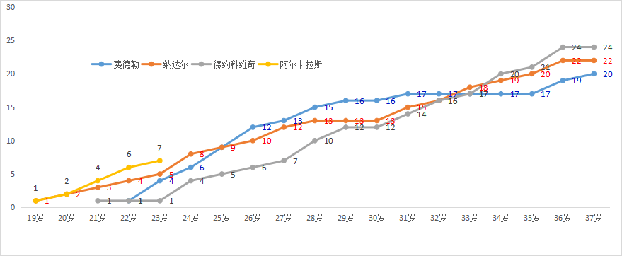 趁着澳网的预热还在,整理了一个网球三巨头和阿尔卡拉斯同年龄的大满贯冠军数据(注:为了方便,年龄=夺冠年份-出生年份,与通常意义上的年龄有所不同)。通过这张图,阿尔卡拉斯目前的大满贯冠军数,通过了同年龄的三巨头。阿尔卡拉斯起步很高,大满贯冠军数的天花板看三个因素,第一也是最主要的,就是职业生涯巅峰期(28岁之前)这几年每年能夺几个大满贯冠军了;第二,是看职业生涯能否持续到35岁左右还能夺得大满贯;第三,就是看05后、10后球员的实力如何了。